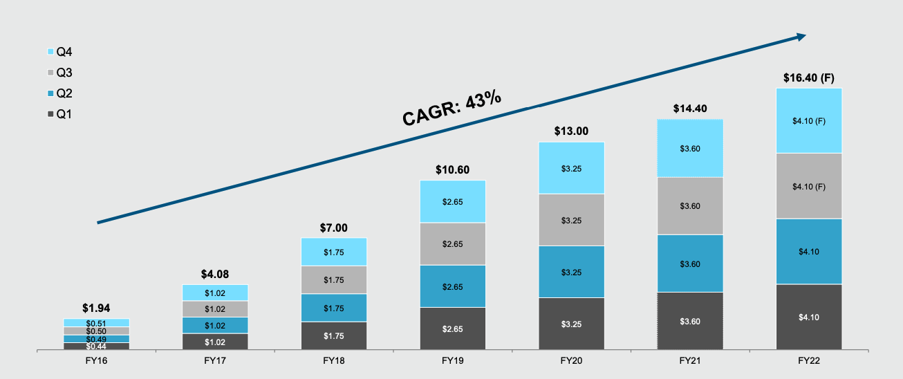 브로드컴의 배당 성장은 그래프로 보면 그 성장 규모를 체감할 수 있습니다. 브로드컴의 배당은 대부분 미국기업과 마찬가지로 분기 배당이며 3,6,9,12월에 배당금이 지급됩니다. 2016년부터 배당금의 CAGR은 43%에 달합니다. (CAGR : 연평균 성장률)