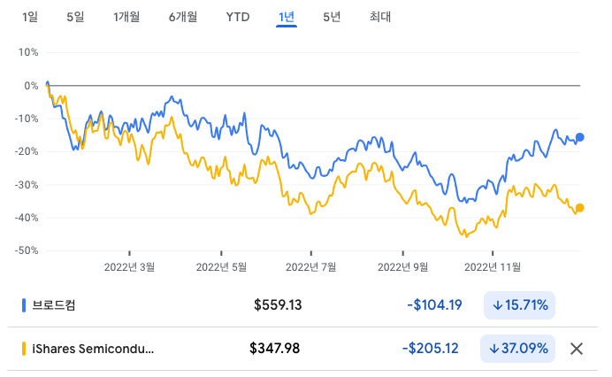 반도체 불황으로 인한 대다수의 반도체 기업의 실적과 주가가 하락했지만 브로드컴은 상대적으로 선방한 실적과 주가 흐름을 보여줬습니다. 모든 반도체 기업을 추종하는 SOXX 대비 나은 수익률을 거뒀습니다. 물론 브로드컴은 상승장일 때는 엔비디아, AMD, AMAT, KLA 등 회사보다 상승폭이 작다는 특징이 있습니다.