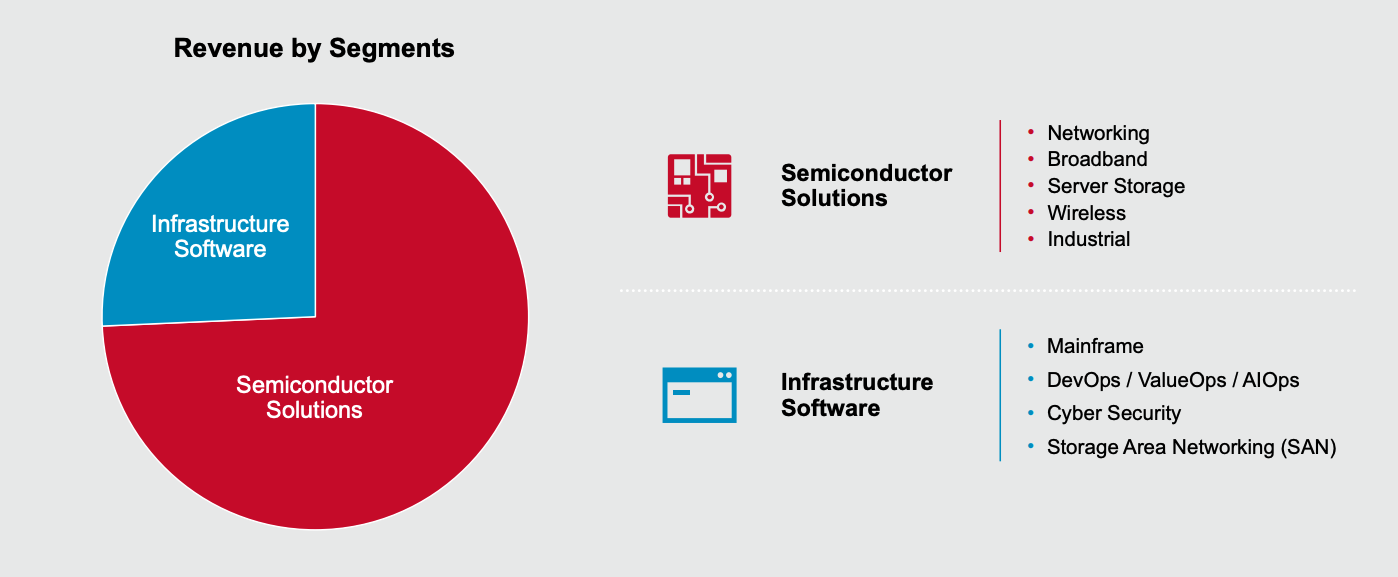 첫 번째 사진에서도 나타났지만 현재 브로드컴은 수많은 기업들이 인수합병 끝에 생겨난 기업입니다. 그렇기에 판매하고 있는 제품이 매우 다양하지만 크게 반도체와 소프트웨어로 나눌 수 있습니다. 그중에서 반도체 제품이 차지하는 비중이 75%에 달합니다. 파이버 채널(Fibre Channel HBAs), 레이드 컨트롤러(레이드 어댑터), 이더넷카드(NIC), STB (셋톱박스 Satellite, Cable, IPTV), Wi-Fi 라우터, CMTS, 케이블 모뎀, GNSS 리시버, 광센서(Optical Sensors) 등이 있습니다. 각종 기업의 인프라, 제품의 필수 제품으로 사용되지만 B2B 기업이기에 일반 대중들에게 인지도가 낮은 게 이해가 갑니다.