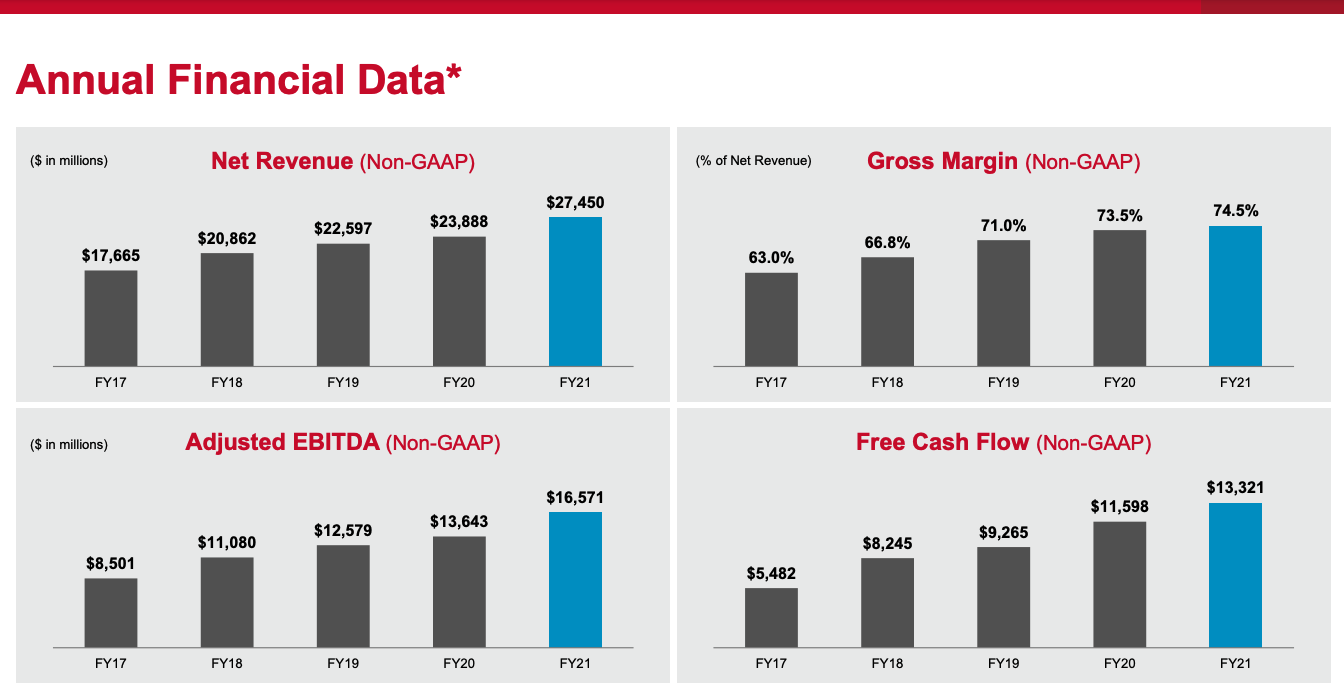 브로드컴은 4차 산업혁명으로 일컫는 미래 반도체의 핵심 부품을 제공하는 기업으로서 실적도 매우 우수합니다. 논갭 기준으로 순수익, 매출 총이익(Gross Margin), 조정 EBITDA, FCF (프리 캐시 플로우)가 해가 지날수록 증가하는 것을 확인할 수 있습니다. 인수합병으로 몸집을 불린만큼 VM웨어 인수에 성공한다면 하드웨어 중심 기업에서 소프트웨어 영역에서도 강자가 될 것이라고 기대하고 있습니다.