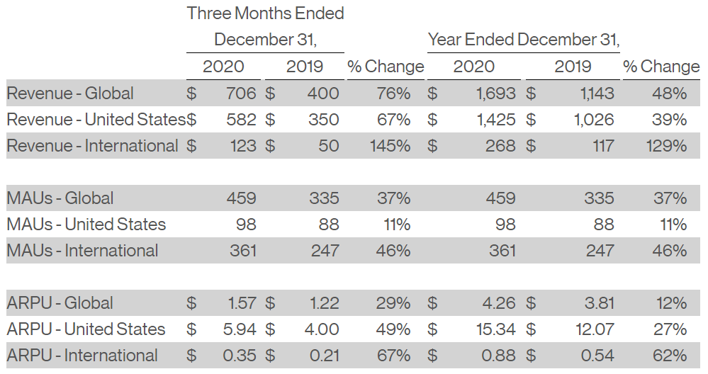 핀터레스트의 월간 이용자수는 (MAU) 4억명이 넘고 밀레니얼 세대, Z세대로 불리는 젊은 이용자가 많습니다. 구매력이 떨어지는 연령대의 비율이 높은 게 장점이냐는 반박도 있지만 지금까지 있던 소셜미디어들의 흐름을 돌이켜볼때 아래에서 위로 유행을 타면서 대세 SNS가 되고 주가도 상승했지 반대의 케이스는 찾을 수 없습니다. 꾸준히 새로운 피를 수혈하면서 이용자 파이를 늘려가며 매출 증가를 이룬다는 점에서 핀터레스트의 높은 젊은 세대 비율은 매우 큰 장점입니다.
